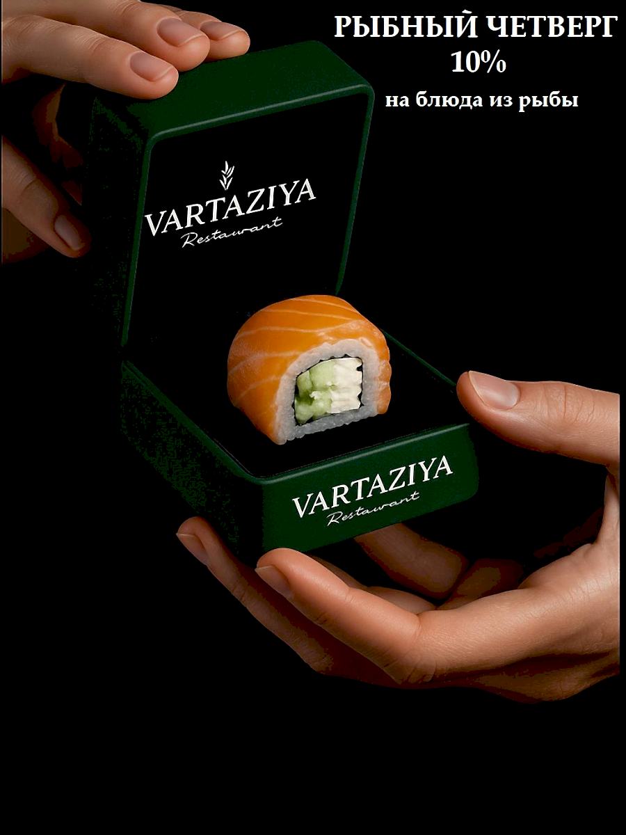«Вартазия» - ресторан с необычным интерьером и авторским меню. Здесь Вас ждут вечера с живой музыкой, аквариум с морепродуктами и авторские блюда и напитки. Pin-Up и интерьер ресторана созданы по концепции фантазийной страны, которая находится среди вулканов и утопает в зелени. Внутри большого основного зала с потолка свисает ива, создавая ощущение, что каждый гость находится в гуще ветвей. Уютное, чуть приглушённое освещение внутри создает особую атмосферу. В этом же зале вечером пятницы или субботы можно послушать, как играет редкое фортепиано 1906 года.